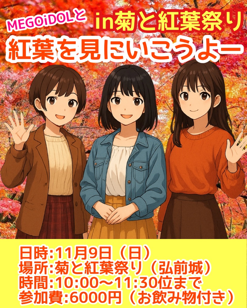 2025年11月9日(日)10:00〜11:30(予定)🍁秋のスペシャル企画🍁MEGOiDOL撮影会【紅葉を見にいこうよー!】開催🍁秋色に染まる弘前城で、MEGOiDOLと最高の一枚を撮ろう📸✨*1ドリンクサービス付き下記よりご予約をお願いします。お支払い選択は【店頭払い・店頭受け取り】を選択して頂きます様宜しくお願い致します。